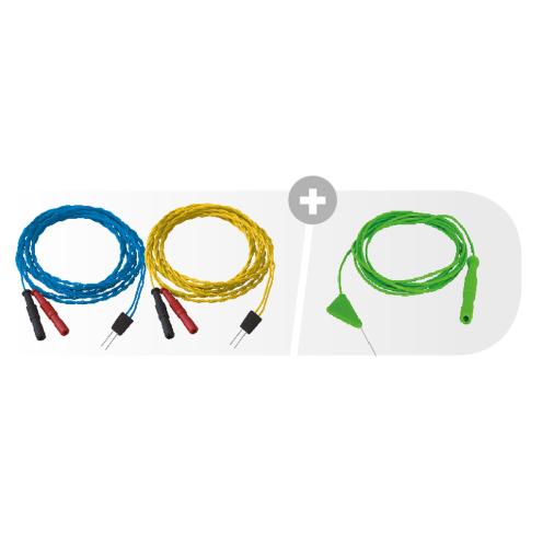 1,5 mm Sicherheitsstecker DIN42802, 5x Elektrode blau, 5x Elektrode gelb, Nadellänge 12mm, Nadelabstand 2,5mm, Kabellänge 1500mm, 5x SDN Trigon Elektrode grün 15/1500, Einmalprodukt, ETO-sterilisiert