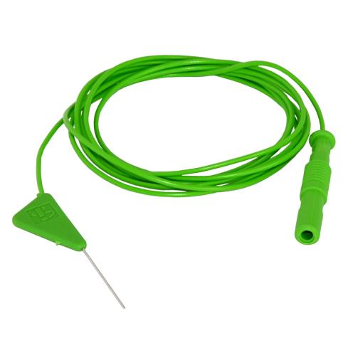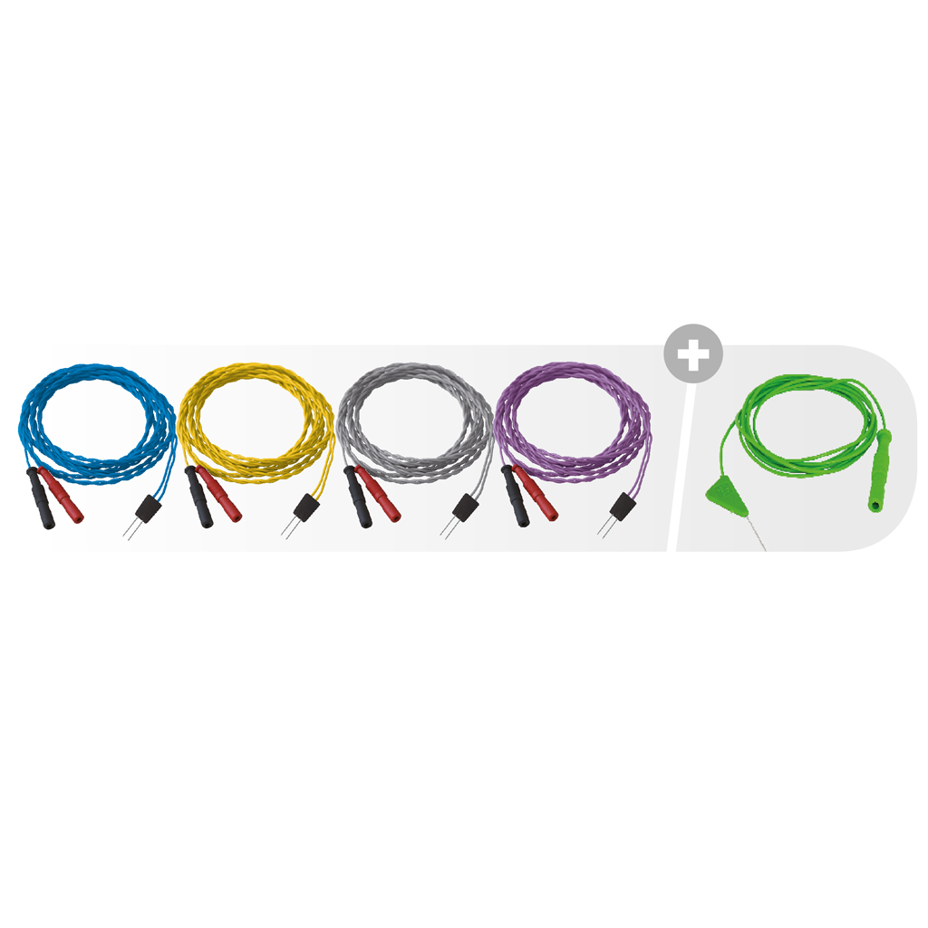 1,5 mm Sicherheitsstecker DIN42802, Je 4x Elektrode blau, gelb, violett, grau, Nadellänge 12mm, Nadelabstand 2,5mm, Kabellänge 1500mm,4x SDN Trigon Elektrode grün 15/1500, Einmalprodukt, ETO-sterilisiert